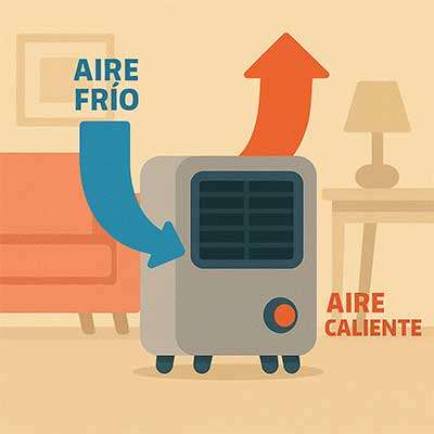 - ¿Cómo sucede? Un elemento calefactor interno (una resistencia eléctrica, una placa cerámica, o aceite caliente en un radiador) se calienta. El aire frío y denso de la habitación es atraído hacia la parte inferior del calentador. Al pasar por el elemento caliente, el aire se calienta, se vuelve menos denso y asciende. Este aire caliente sube y se expande por la habitación, empujando el aire más frío hacia abajo, creando un ciclo constante de circulación.
